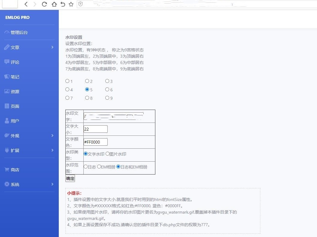 当Emlog博主上传图片的时候,可以按照插件的设定给图片添加文字或者是图片类型的水印标志。
