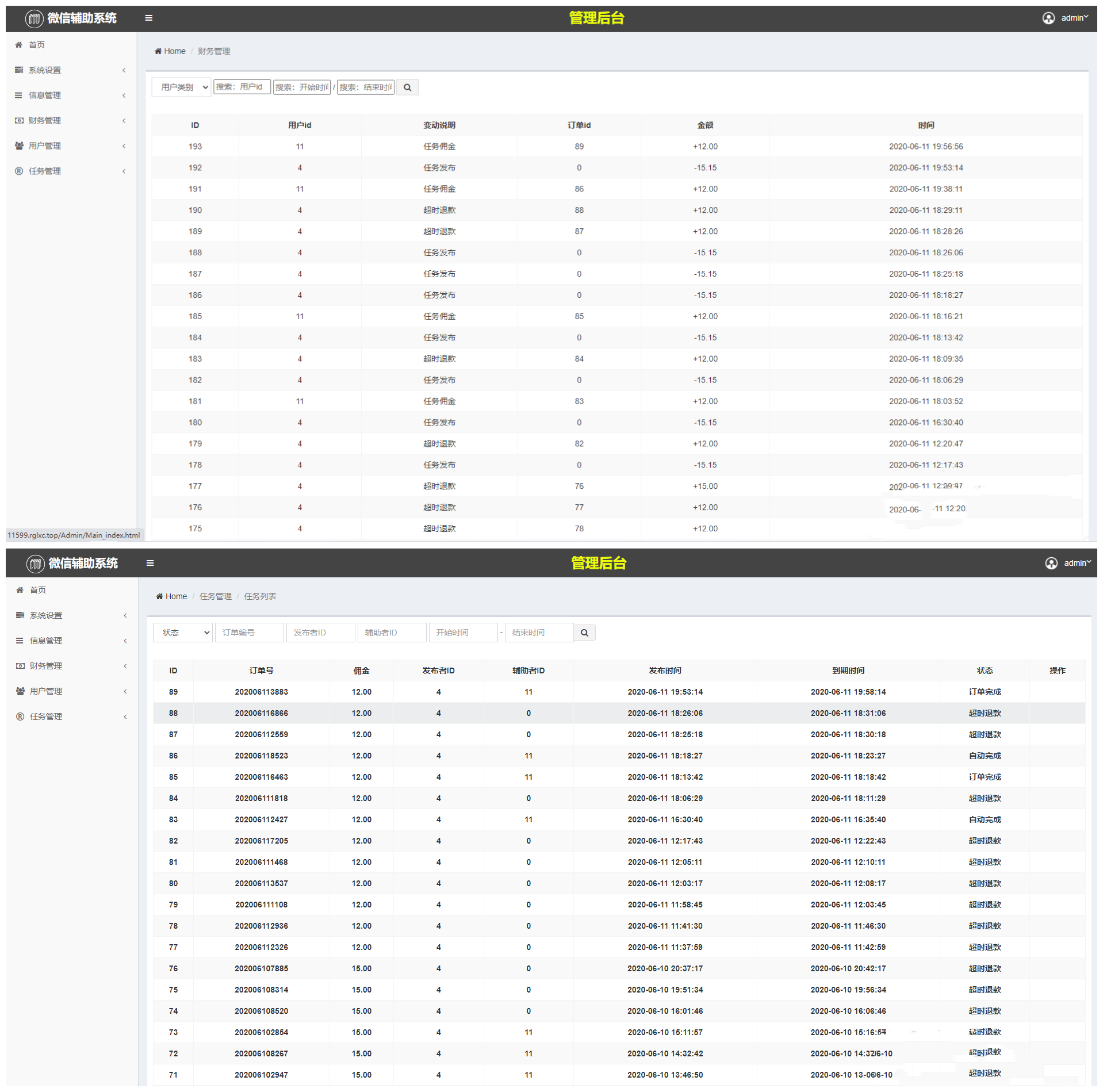 本系统包括:做单端、下单端、总后台三端。结合微信辅助流程,严格定制的一套自动化任务平台。