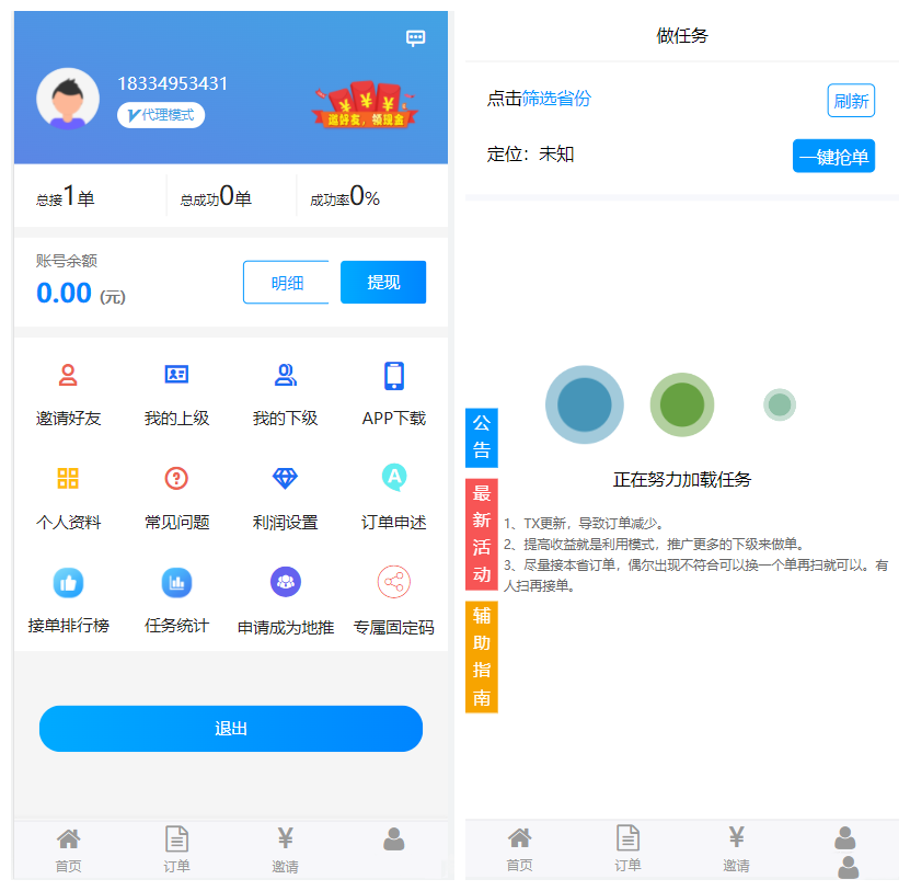 1.5做单端具备邀请功能,邀请下级成功做任务后,返佣金比例给上级做单员。