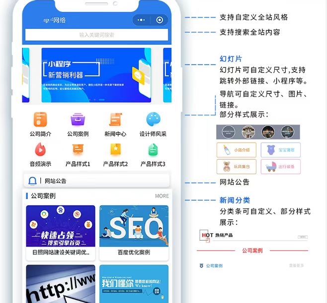 支持创建多个小程序!(理论上只要服务器配置够,可以生成无限个) 可在后台修改全站主题色 支持自定义底部菜单、自定义广告位 支持多种栏目展现方式,包括带缩略图新闻、无缩略图新闻、一行两列图片列表、一行一列图片列表等等 支持多种栏目修饰样式和导航样式 支持自定义表单,管理员微信能够实时查看客户新提交的表单内容 支持做成小程序导航网站 支持播放视频、所有页面转发、在线客服、一键拨号、地图导航