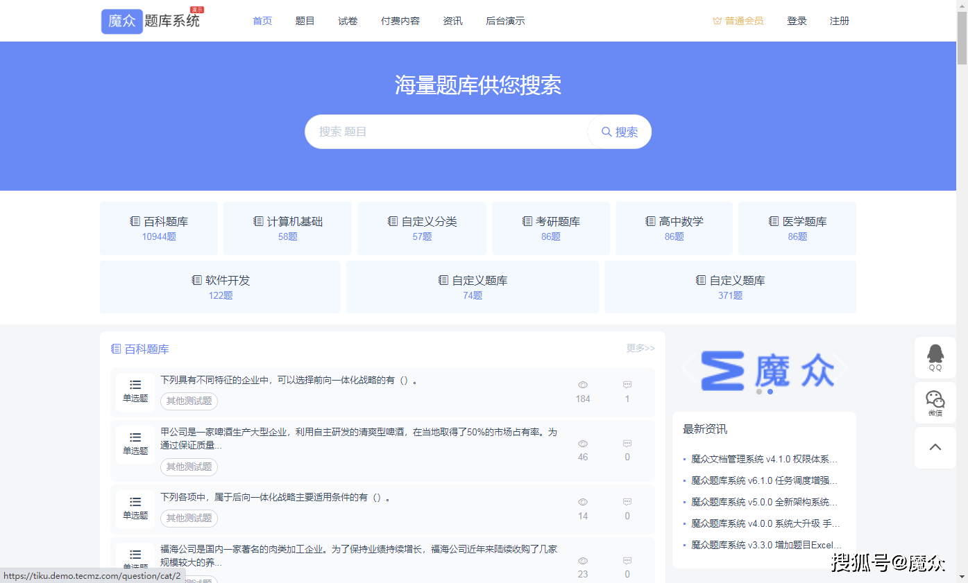 魔众题库系统发布v7.5.0版本,新功能和Bug修复累计40项,连续增加题目,题目公开快捷操作。