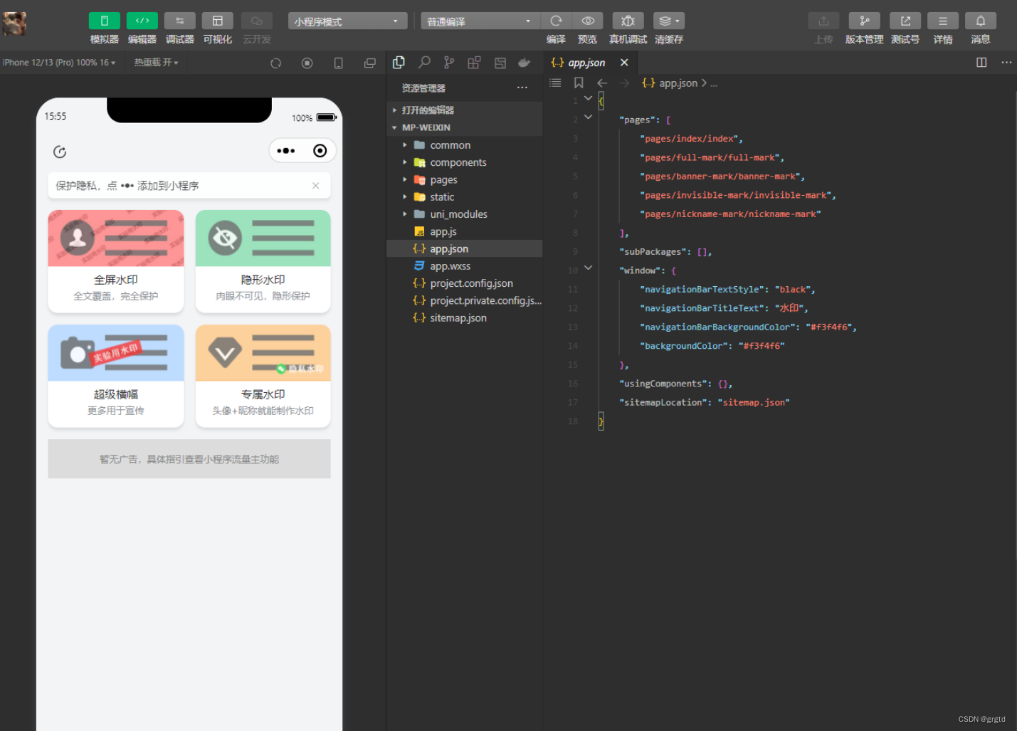 黎明加水印微信小程序源码 四种类型非常简洁 支持从聊天记录选择文件、相机拍摄、直接选择文件 · 支持白底、黑底 的隐形水印,制作后,通过增加蒙版 方能看到水印 · 纯前端,可嵌入任何项目